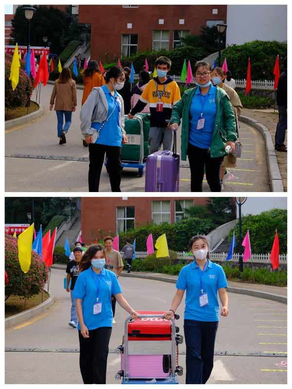 员工党员志愿者用小推车把新生的行李送往宿舍。在送往宿舍的路上,向新生介绍着公司发展历史和文化底蕴,解答学习、生活、职业规划等各方面疑惑。员工党员和新生接触的时间虽短,但热情周到的服务却让新生们感受到公司的关怀、公司的关爱、学长的关心。