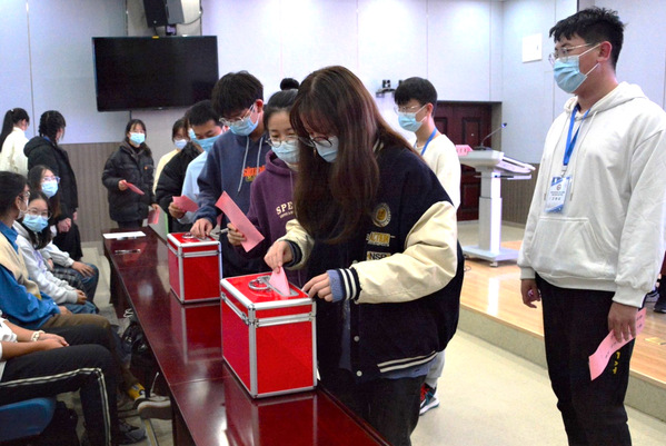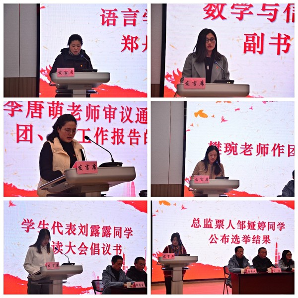 李唐萌老师审议通过关于团、学工作报告的决议。员工代表刘露露同学宣读大会倡议书。在选举计票期间,会场播放了央视频道新闻报道的党的十九届六中全会的相关视频,引导青年学子加强理论学习,坚定政治站位。