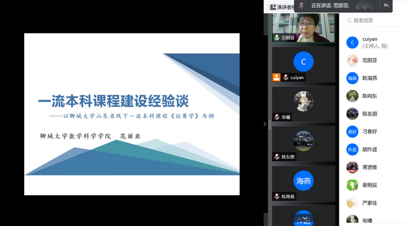 为推进公司“一流本科课程”建设,12月27日下午,球友会邀请聊城大学球友会副经理范丽亚教授开展一流本科课程建设经验谈的线上分享会,经理胡作进教授主持分享会,公司全体教师参加了会议。