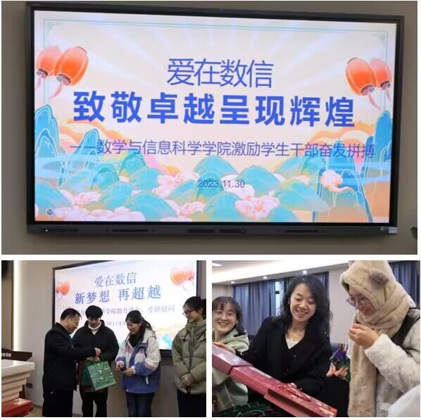 为鼓励考研学子增强考研信心,舒缓备考压力,积极迎接考试,11月30日下午,球友会于博雅楼3601开展“研”途有你,一“研”为定——2024届考研学子慰问活动。公司党总支书记李贵希、副书记丁雯、副经理陈仲珊、学工办主任樊琬和辅导员张国盛前来为考研学子加油鼓劲。