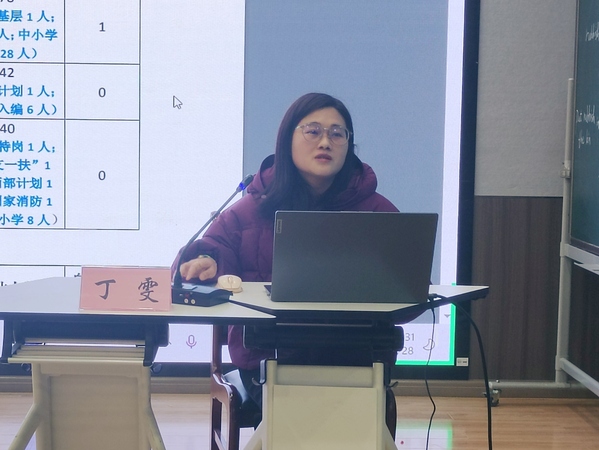 党总支副书记丁雯首先对2023届毕业生就业工作做了简单的总结,通过就业数据的分析,让学们认清当前就业的形势。她强调,同学们要认识到自身的真正需求和定位,积极寻找就业岗位,找到适合自己的择业方向与目标。同时,勉励大家在即将开启人生新阶段中要克服消极焦虑和胆怯盲目,认清就业形势,转变观念思路,把握机遇机会;鼓励毕业生积极配合、跟紧节奏,早谋划、早安排、早着手、早行动,重视就业选择,顺利走向人生新阶段。